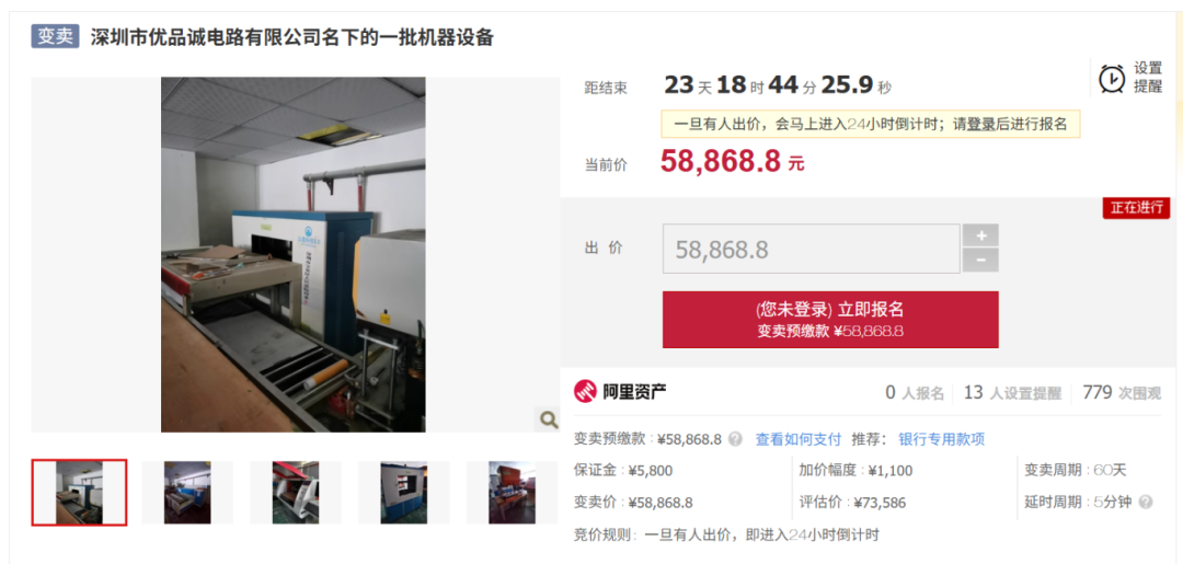 6月10日,深圳市宝安区人民法院对被执行人深圳市优品诚电路有限公司名下的一批机器设备发布变卖公告。该批设备于2025年6月18日10时至2025年8月17日10时(延时除外),通过法院淘宝网司法拍卖网络平台公开变卖,目前设备正处于变卖阶段。
