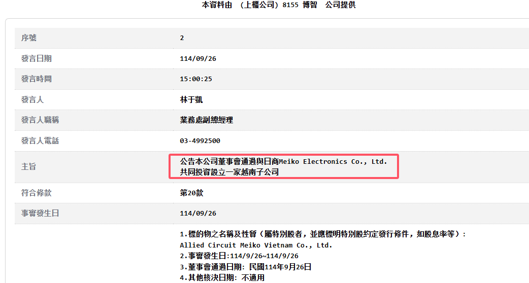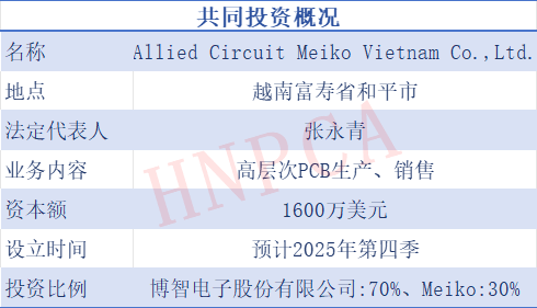 9月26日,台资PCB企业博智(8155.TW)发布公告称,公司决议与日本PCB企业Meiko Electronics Co.,Ltd.(名幸电子,股票代码6787.T)共同投资1600万美元在越南设立PCB厂——Allied Circuit Meiko Vietnam Co.,Ltd.(暂定名),由博智电子持股70%,预计2026年试产,2027年量产并逐步扩产。