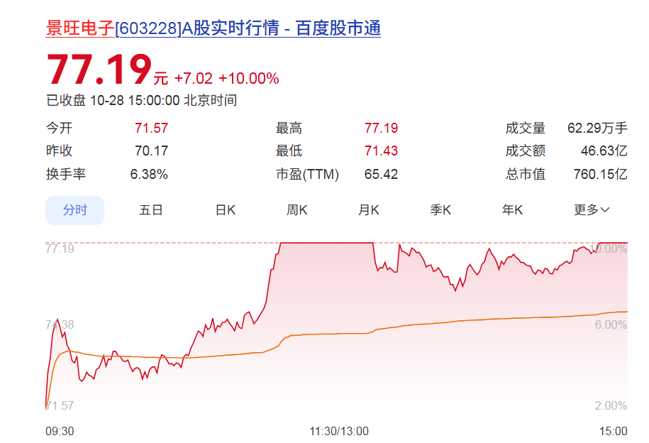 当日收盘,景旺电子股价涨停,报77.19元,总市值达760.15亿元。