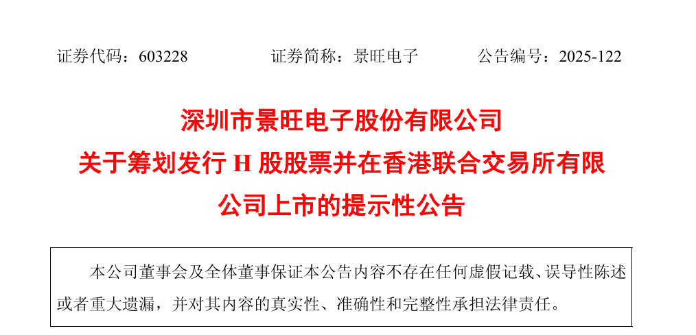 10月28日,景旺电子(603228.SH)公告称,公司正筹划境外发行股份(H股)并申请在香港联交所主板上市。此举旨在深化全球化战略布局,提升国际品牌形象与综合竞争力,同时拓展多元化融资渠道。