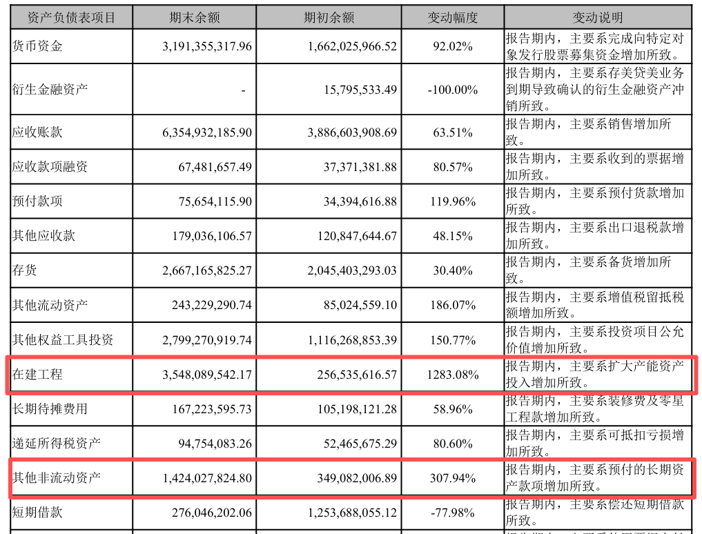 报告期内,公司在建工程规模快速扩大,由年初的2.57亿元增至35.48亿元,增幅高达1283.08%。其他非流动资产也由年初的3.49亿元增至14.24亿元,增幅307.94%,主要源于预付长期资产款项的增加。研发投入为6.08亿元,同比增长84.43%。
