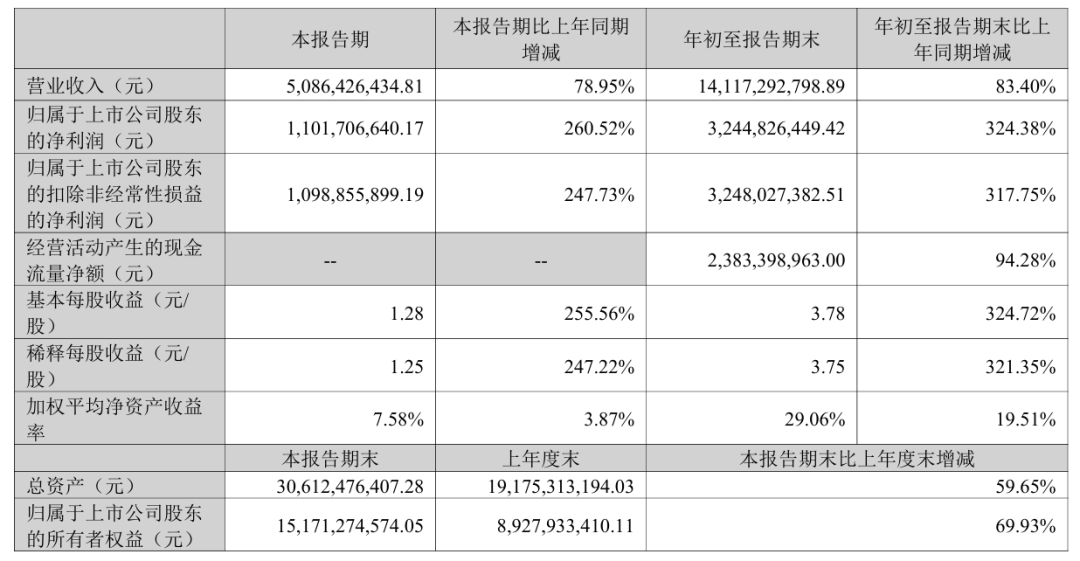 第三季度,公司实现营收50.86亿元,同比增长78.95%;归属于上市公司股东的净利润11.02亿元,同比增长260.52%;扣非净利润10.99亿元,同比增长247.73%;基本每股收益1.28元。