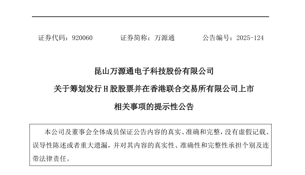 10月24日晚,北交所上市的PCB制造商万源通(920060.BJ)发布公告称,为满足公司国际化战略发展及海外业务布局的需要,提升国际品牌知名度,满足海外公司融资需求,公司正根据总体发展战略和经营规划,筹划境外发行股份(H股)并在香港联合交易所有限公司挂牌上市的相关事宜。